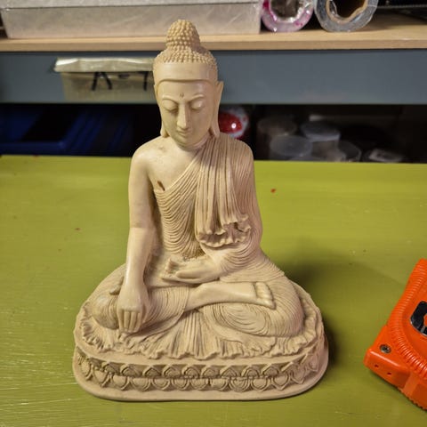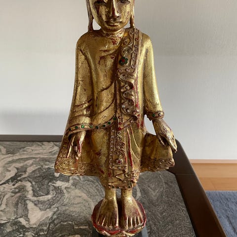 Buddha figur dekorationsfigur i guldfarvet finish. Figuren forestiller en siddende Buddha med detaljeret overflade og dekorationer i blandt andet grønne nuancer. Egnet som indretningsobjekt eller pynt til hjemmet hele året og kan også bruges i forbindelse med andre højtider. Materialet fremstår som trælook en hård, malet masse. Kan placeres på hylde, bord eller vindueskarm som rolig og dekorativ figur. H24cm B 17cm