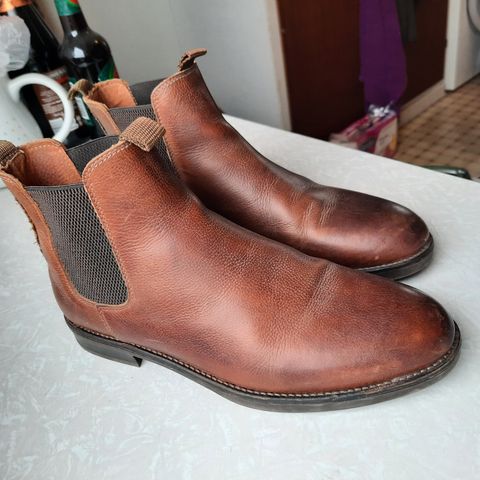Ægte læder med en sål af rå gummi på 0,5cm og en bred flad hæl på 1,5cm.