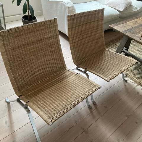2 stk. Poul Kjærholm PK 22 i flet med stel af børstet stål Produceret af Fritz Hansen i 2004. Den ene stol har enkelte brud på flet i den ene side. Se billede. Stolene er i øvrigt i god stand og har mest været til pynt. Er blevet vedligeholdt efter foreskrifterne. Sælges samlet.