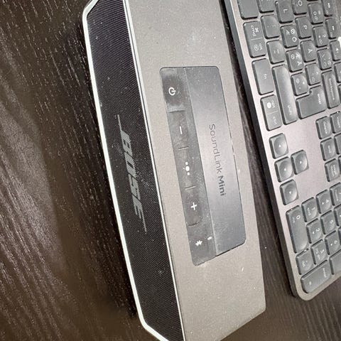 Bose SoundLink trådløs højttaler i sort. Kompakt model egnet til brug på bord, hylde eller med på farten. Højttaleren har betjeningsknapper på toppen og tilslutningsmuligheder på bagsiden, herunder strømtilslutning og aux-indgang. Leveres med strømforsyning som vist på billederne. Velegnet til trådløs afspilning af musik fra kompatible enheder via Bluetooth.
