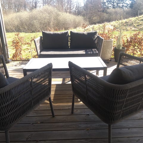 Et komplet sæt, der er klar til brug på terrasse eller altan – perfekt til afslapning i solen.