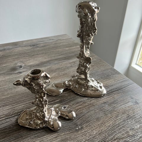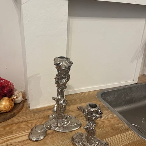 Pols Potten lysestage i sølvfarvet metal med organisk, skulpturel form. Lysestagen er udformet med en ujævn, struktureret overflade og en bred fod, der giver stabilitet på bord eller hylde. Egnet til almindelige stagelys og kan bruges som enkeltstående objekt eller sammen med andre lysestager som en del af en borddækning eller dekoration i hjemmet. Let stearin rester på dem begge. Prisen er for begge lysestager
