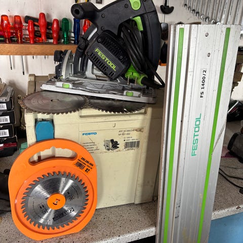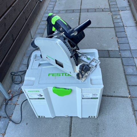 Festool TS 55 FEBQ dyksav. El-drevet rundsav til præcisionssnit i træ og pladematerialer. Modellen er beregnet til brug med føringsskinne og har tilslutning til støvudsugning. Egnet til både bygge- og snedkeropgaver, hvor der ønskes rene og lige snit.