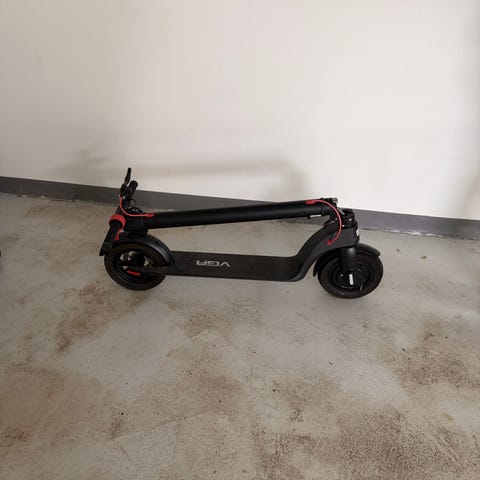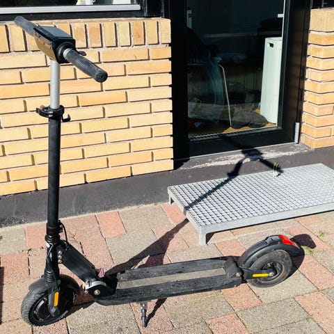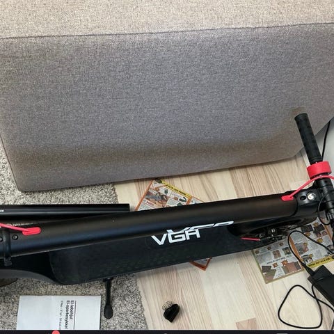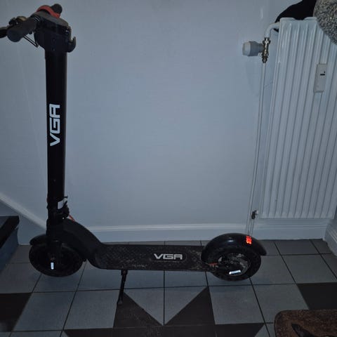VGA el-løbehjul med digitalt display i styret og håndbetjent bremse. Løbehjulet har massive hjul med hulmønster, skivebremse bagtil og sammenklappelig styrstamme med låsemekanisme.