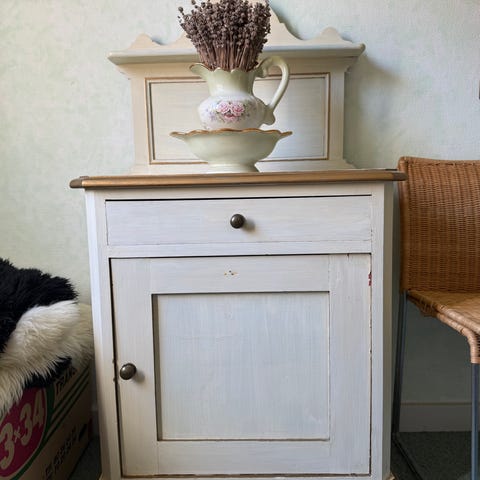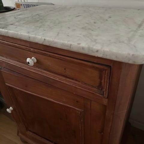 Fint lille fransk servante møbel / kommode, kan f.eks. bruges på badeværelset eller som natbord. Malet hvid med marmorplade. Umalet indvendigt, men med selvklæbende blomstret tapet på hylde og i bundet, som nemt kan pilles af. Kan hentes på Nørrebro. Hurtig afhentning prioriteres.