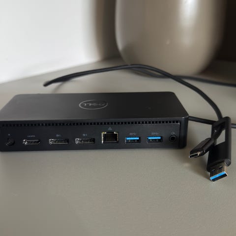 Har HDMI, 2x DisplayPort, VGA, USB-A, USB-C, Thunderbolt 3 og Ethernet.