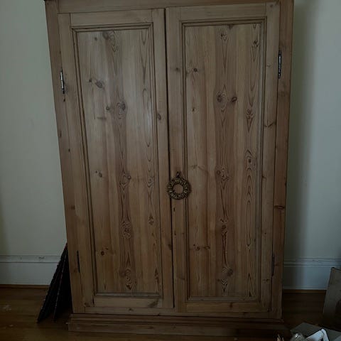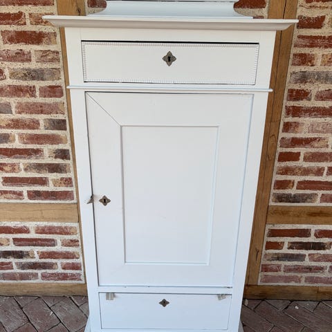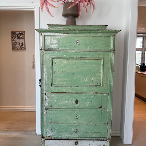 Fin gammel karlekammer skab - pynteliste for oven kan tages af - måler 12 cm - så skabet er 194 cm i alt med pyntelisten . Det er ca fra 1910 men i god stand