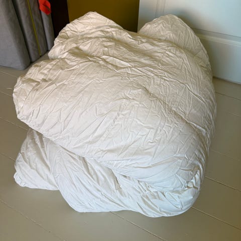 Dynen leveres i en bomuldspose med bindebånd, så du kan rulle den sammen og gemme den af vejen, når den ikke er i brug. Du kan også bruge posen som vasketøjspose eller til opbevaring af andre personlige ting.