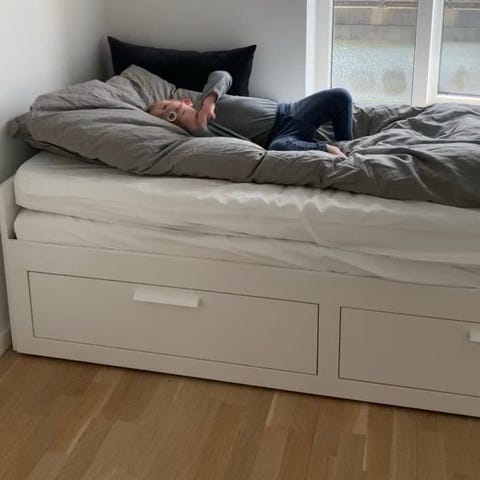 IKEA BRIMNES stel med opbevaringsskuffer i hvid. Sengen har integrerede skuffer under liggefladen, som kan bruges til opbevaring af sengetøj, tæpper eller tøj.