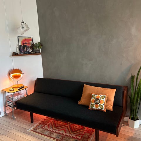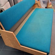 Sovesofaen er betrukket i blå uld.
