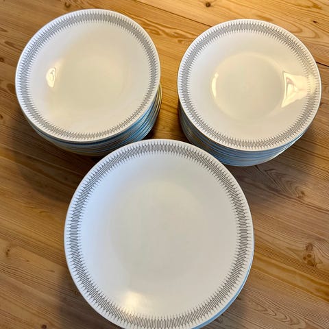 Tallerkenerne er brugte og har almindelige brugsspor/ridser, men fremstår stadig pæne og fuldt funktionelle.