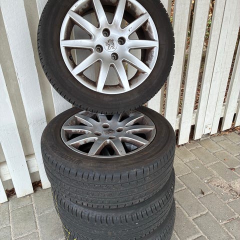 Peugeot Alufælge 16 tommer med gode michelin sommer dæk.Har ikke brugt dem sidste 4 år men de var opbevaret et mørkt og tørt sted.