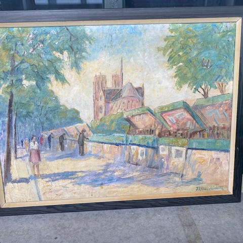 P. Claremont maleri af et landskab med marked og kirke. Maleriet er udfort i olie pá larred og viser en udendors scene med boder, traer og en kirke i baggrunden. Signeret af kunstneren R. Claremont.