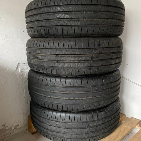 4. Hankook dæk med 4. mm mønster tilbage, hvoraf 2 af dem er slidte i side fra forhjul. Et med korrekt udført lapning.