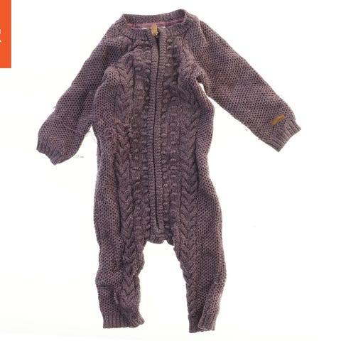 En grå babydragt strikket i et varmeisolerende stof. Dragten har lange ærmer og ben samt en hætte til ekstra varme. Den lukkes med knapper foran, hvilket gør den let at tage af og på. Dragten har en kabelstrikdetalje langs knaplukningen.