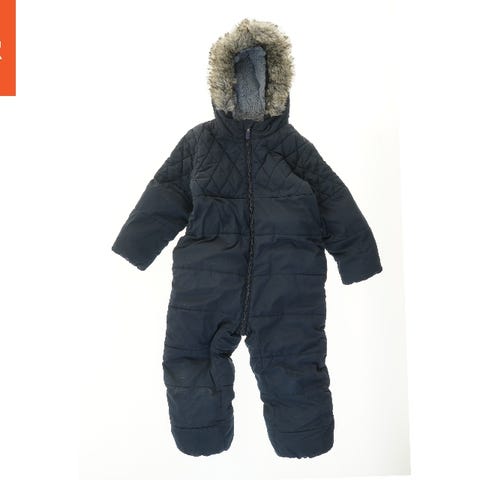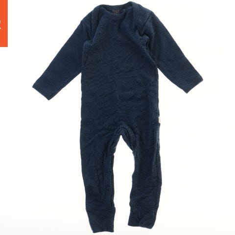 En lyseblå baby heldragt med hætte og lange ærmer. Dragten har en gennemgående lynlås foran og er quiltet for varme. Egnet til brug i koldt vejr for at holde barnet varmt.