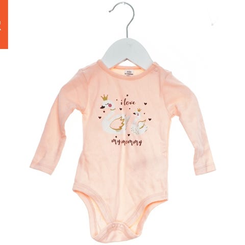 Langærmet lyserød bodystocking med en trykknaplukning ved skulderen. På forsiden er der et print med to svaner med kroner og teksten "I love my mommy" omgivet af små hjerter i forskellige nuancer. Bagsiden er ensfarvet lyserød.