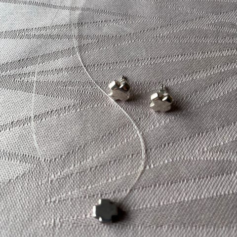En simpel og elegant sølv halskæde med et korsvedhæng. Vedhænget har et moderne design med en mat overflade, hvilket giver et stilrent udtryk. Øreringene, til huller i ørene, er ligeledes med mat overflade.