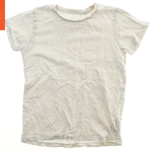 En kortærmet hvid T-shirt med rund halsudskæring. Stoffet ser let krøllet ud.