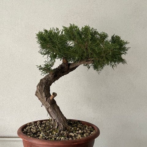 Bonsai af Juniperus chinensis i semicascade-stil, meget tæt, sund og velplejet.