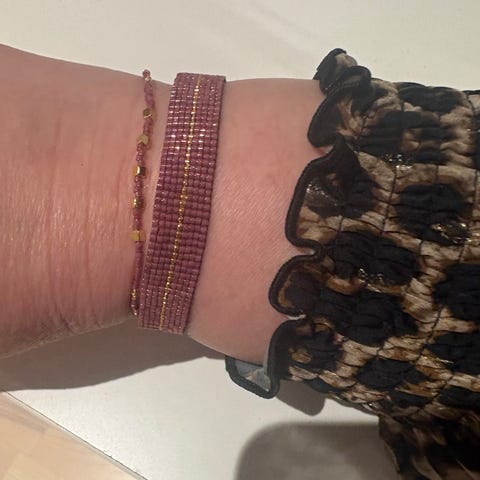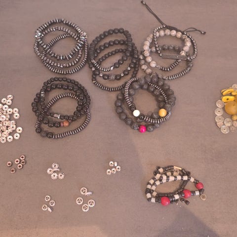 Armbånd sæt bestående af flere armbånd med sten og metaldele. Armbåndene ses i forskellige farver, blandt andet rosa, rød, lilla, klar, grøn og blå. Nogle armbånd er lavet med facetterede stenperler, andre med små klare sten i række, samt modeller med krydsformet mønster mellem stenene. Velegnet som smykke til håndleddet og kan bæres enkeltvis eller flere sammen for et mere markant udtryk.