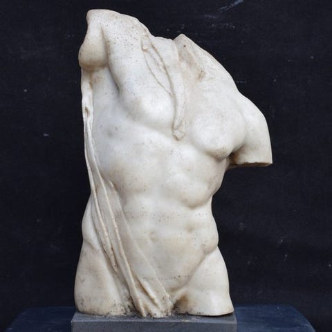 Lotto af 10 stykker frugt (drueklase (2), pære, fersken, æble, citron osv.) håndlavede af Carrara-marmor af håndværkere