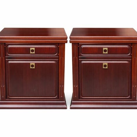Et par professionelt restaurerede fyrretræsnatborde i dybt sort med originale ornamenterede beslag i guld, fire skuffer, mål: 68 cm høj, 51,5 cm bred og 38,5 cm dyb, fremstillet i Portugal og dateret til 1990–2000, i fremragende stand. Klik på den blå "gå til varen" knap, for at købe eller byde på denne vare. Den samlede pris vil blive vist inden du afgiver dit bud.