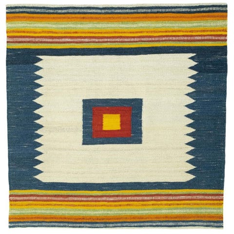 Oprindelse Tyrkiet, model Håndvævet Designer Kelim, materiale uld på uld, mål 102 × 100 cm, i meget god stand og professionelt renset. Klik på den blå "gå til varen" knap, for at købe eller byde på denne vare. Den samlede pris vil blive vist inden du afgiver dit bud.