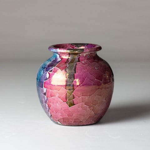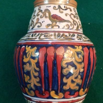 Vigtigt terracotta-krukke tilskrevet Gaetano Corradini, fremstillet ved den historiske Montelupo Fiorentino-fabrik (Samminiatello), som angivet af det indprægede mærke. Værket udmærker sig ved sin harmoniske form og sin maleriske dekoration, der viser en let overfladisk slid: en egenskab som ikke underminerer værdien, men tværtimod styrker den gamle, markante og autentiske stemning i genstanden.