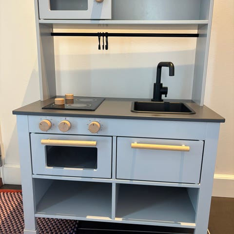 Ilva legekøkken i træ til børn i rosa farve. Legekøkkenet har komfur med fire kogeplader, ovn med gennemsigtigt vindue, vask med vandhane samt opbevaringsplads bag stofgardin. Egnet til rolleleg i børneværelse eller legehjørne.