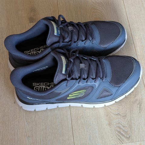 Skechers Slip-ins sneakers i størrelse 39,5. Modellen er mørkeblå med lys sål og Skechers-logo på siden. Overdelen er en kombination af tekstil og syntetisk materiale med mesh-detaljer for åndbarhed. Slip-ins-konstruktion gør det muligt at tage skoene på uden at binde snørebånd. Sålen er let og fleksibel med mønster for bedre fodfæste. Velegnet som hverdagssko eller til let aktivitet. Helt nye og ubrugte.