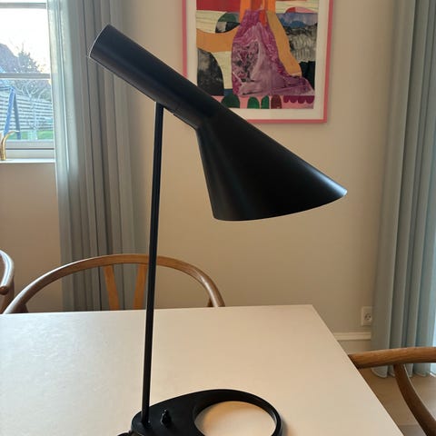 Louis Poulsen AJ bordlampe designet af Arne Jacobsen. Bordlampen er udført i sort farve og er velegnet som arbejds- eller læselampe på bord eller skrivebord. Lampen bruger E14 lyskilde op til 40W (jf. æskeangivelse). Klassisk bordlampe med retningsbestemt lys og karakteristisk skærmform, egnet til både hjem og kontor.