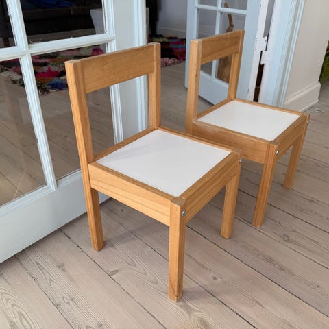 børnestol i hvidmalet træ. Lav siddehøjde egnet til mindre børn. Stolen har ryglæn og solid ramme med enkle, lige linjer. Velegnet til børneværelse, legehjørne eller som ekstra siddeplads ved børnebord. Sidde højde 22 cm