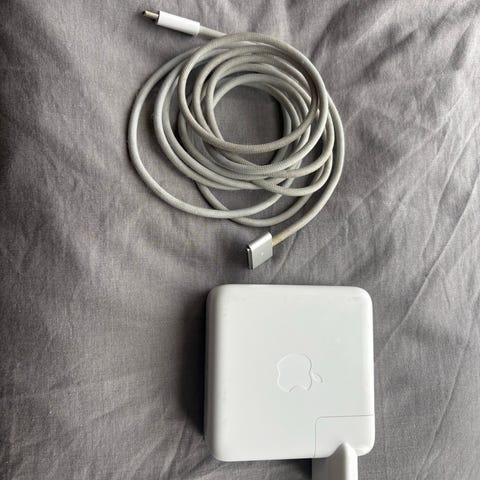 Apple MagSafe strømforsyning adapter i hvid. Med konverter mellem “ny” og gammel type. Strømforsyningen har MagSafe-stik med vinklet konnektor og aftagelig netledning/strømkabel. Velegnet som oplader eller ekstra strømforsyning til kompatible Apple bærbare computere, der bruger MagSafe-stik. Farve: hvid.
