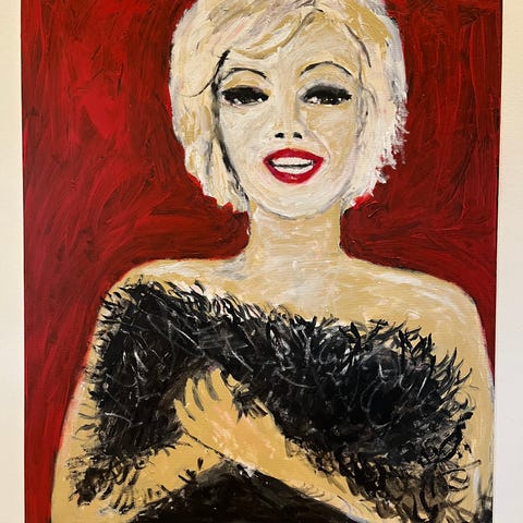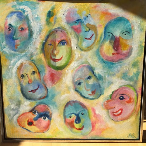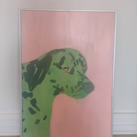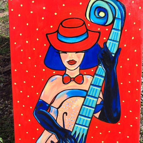 Maleri af Lone Vittrup med farverigt motiv af en dansende kvinde. Billedet viser en stiliseret kvindefigur i blå og gule nuancer med rød baggrund og små prikker. Maleriet er signeret og dateret 2015 i nederste hjørne. Velegnet som vægdekoration i hjem eller kontor, hvor der ønskes et farverigt og grafisk udtryk. 60 x 80 cm lærred på træramme.