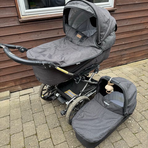 Emmaljunga barnevogn i mørkeblå tektsil uden misfarvning og med sort stel. Vognen har stort liggemål.