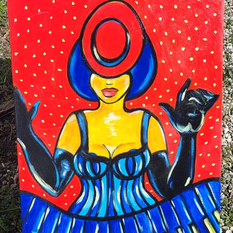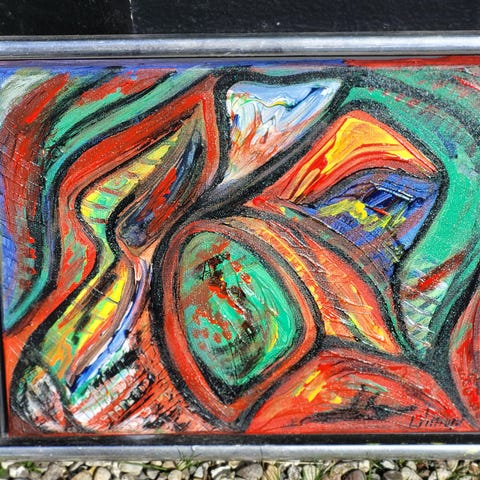 Lone Vittrup maleri med havfrue motiv af kvindeskikkelse og musikinstrument, udført i akryl på lærred. Billedet er kendetegnet ved stærke, klare farver med dominerende blå, gule og røde nuancer på mørk baggrund. Signeret “Vittrup” og dateret 2004 i nederste hjørne. Velegnet som vægdekoration i stue, kontor eller kreative rum. 60 x 80 cm lærred på træramme