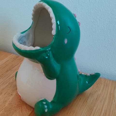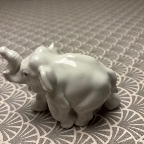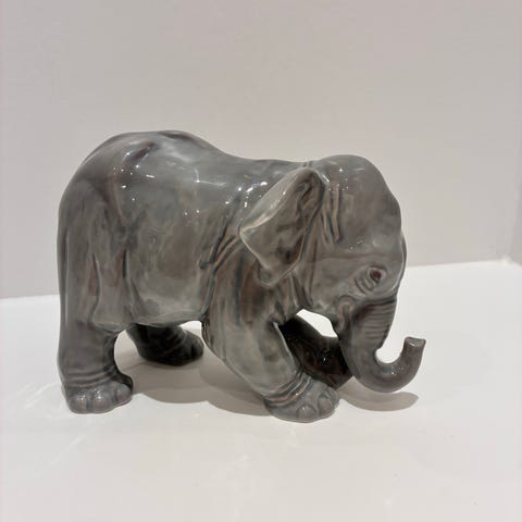 Elefant tændstikholder i grøn porcelæn. Figuren forestiller en elefant med en beholder på ryggen til opbevaring af tændstikker. På siden af beholderen er der en strygeflade til tændstikker. Undersiden har stempel og modelnummer. Velegnet som praktisk beholder til tændstikker eller som dekorativ figur i hjemmet.