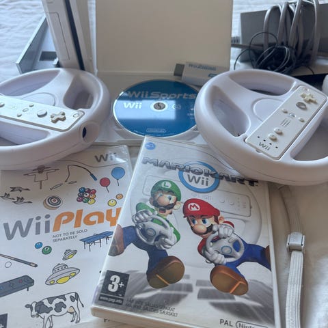 Nintendo Wii konsol med spil, Wii Remote, Nunchuk og rat hvid