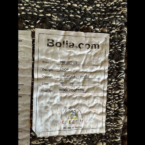 Flot gråt/hvidt uldtæppe fra Bolia (200x300). Tæppet er gået lidt op i siden (men kan nok fikses, hvis man er lidt fingernem) og har lidt slidtage, se billeder, men ellers et virkelig fint tæppe. Ligger flot og jævnt på gulvet.