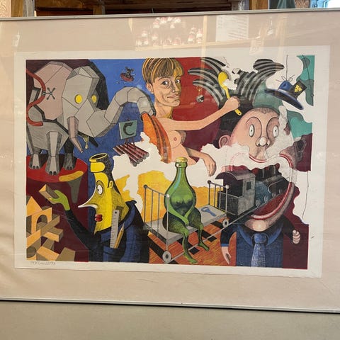 Plakat med grafisk, farverigt motiv i sort ramme.