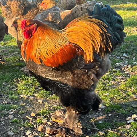 Hanen er meget sød og omgængelig og passer godt på hans damer. Flokken er god og harmonisk og hønsene har aldrig fejlet noget.