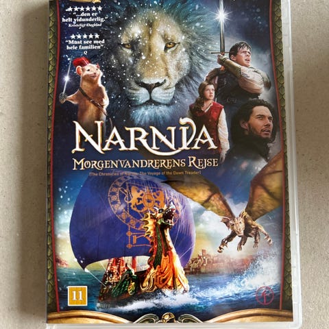 Narnia Morgenvandrerens Rejse dvd film. Udgivelse af fantasyfilmen baseret på C.S. Lewis’ bogserie. Filmen er med dansk tekst og er markeret med aldersgrænse 11 år. Standard dvd-udgave i plastcover med for- og bagsideillustration samt oplysninger om spilletid og lyd-/undertekstmuligheder på bagsiden.