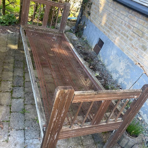 Gammel gæste / felt-seng angiveligt fra Århus dampmølle - antager den er fra ca. 1930. Fuldt funktionsdygtig 🌻Det er papiruld, der ses under bunden af sengen.