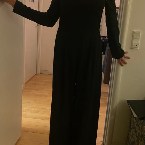 Den har lange ærmer med ribkant og ribkant ved anklerne. Der er lommer i siden.