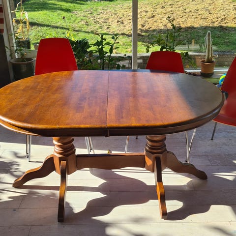 Flot spisebord med udtræk i den ene ende. Altid været dug på, så overfladen er rigtig flot, dog lidt slidt nederst på benene, kan sikkert gøres flot igen. Sælges billigt pga flytning