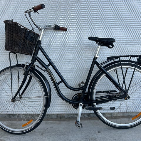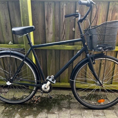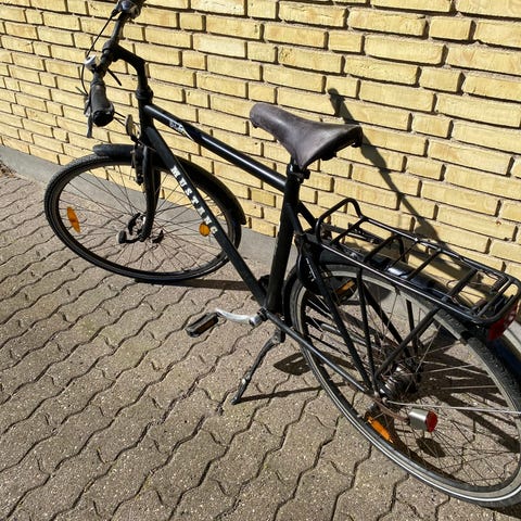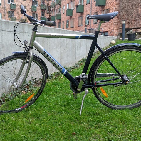 Mustang city-hybridcykel 28" unisex i sort. Cyklen har lav indstigning, bagagebærer og fulde skærme for og bag. Udstyret med dynamolygte bagpå, reflekser i hjulene samt støtteben. Egnede dæk til by- og hverdagskørsel. Stel og skærme viser synlige brugsspor med afskallet maling flere steder. Velegnet som daglig pendler- eller bycykel for både mænd og kvinder, der ønsker en enkel cykel med oprejst kørestilling og 28" hjul.