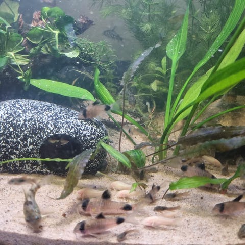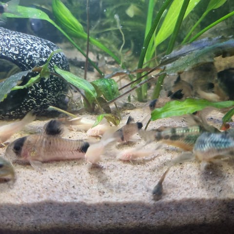En gruppe på 7 stk voksne hvide hoplisoma, tidligere corydoras, panda.