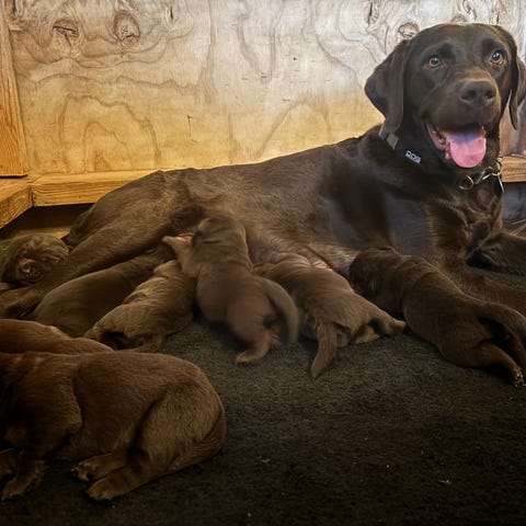 Vores dejlige Mussi fik 8 skønne hvalpe d 19 marts og der er en enkelt tilbage som ikke har fundet nyt hjem endnu . Hvalpene er vokset op som stue opdræt , med alt hvad det indebærer her på egendommen ( børn , ænder og onkel Carlo , som er onkel til hvalpene )