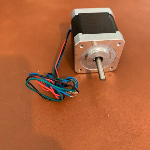 Stepper motor med flerfarvede tilslutningsledninger. Motoren har firkantet hus, frontplade med fire monteringshuller og aksel i midten. Egnet til brug i f.eks. elektronikprojekter.